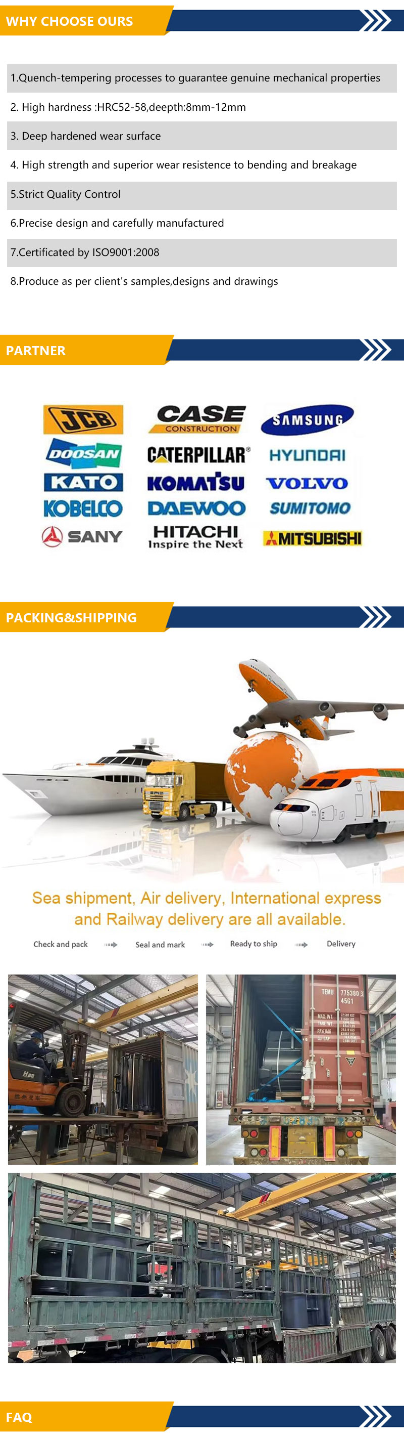 В основном мы поставляем детали ходовой части гусеничных экскаваторов и бульдозеров, такие как опорные катки, поддерживающие катки, звездочки, натяжители, возвратные пружины, гусеничные цепи, башмаки гусениц, болты и гайки гусениц, защита гусеничной цепи, ковши экскаваторов, зубья и адаптеры ковша, звенья ковша, режущие кромки и торцевые насадки, грейдерные ножи, цилиндры стрелы, цилиндры рукояти, цилиндры ковша, пальцы и втулки ковша, поворотные подшипники, удлиненные стрелы и рукояти и т. д.