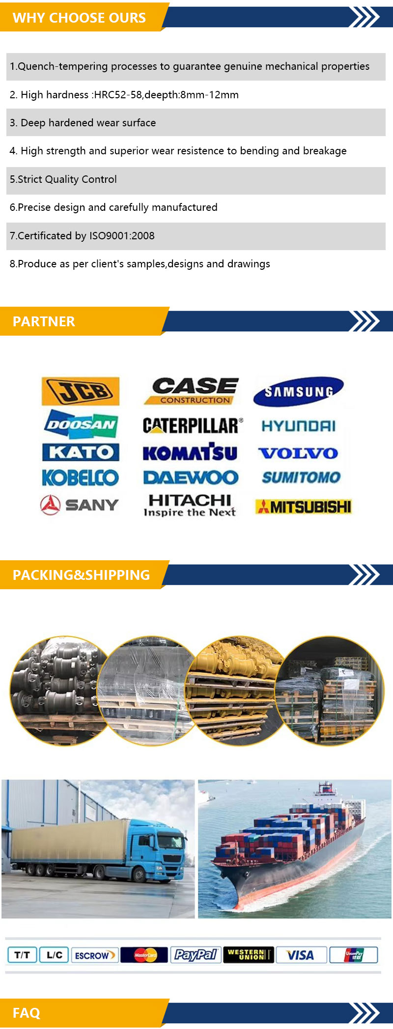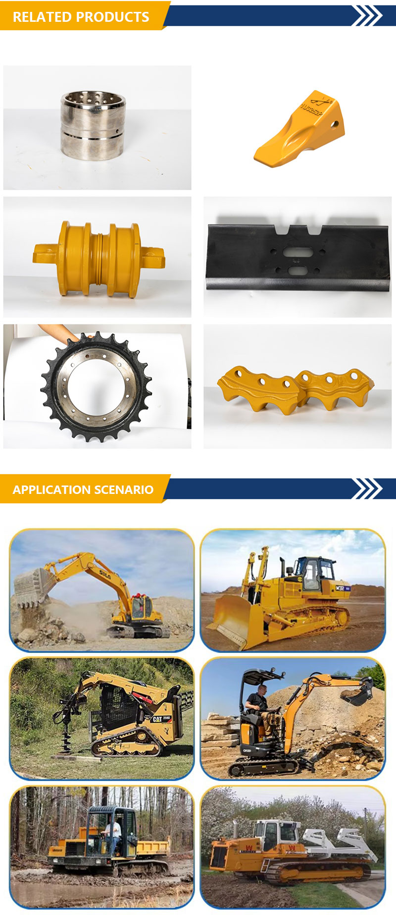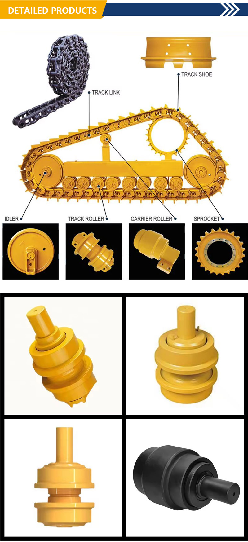 В основном мы поставляем детали ходовой части гусеничных экскаваторов и бульдозеров, такие как опорные катки, поддерживающие катки, звездочки, натяжители, возвратные пружины, гусеничные цепи, башмаки гусениц, болты и гайки гусениц, защита гусеничной цепи, ковши экскаваторов, зубья и адаптеры ковша, звенья ковша, режущие кромки и торцевые насадки, грейдерные ножи, цилиндры стрелы, цилиндры рукояти, цилиндры ковша, пальцы и втулки ковша, поворотные подшипники, удлиненные стрелы и рукояти и т. д.