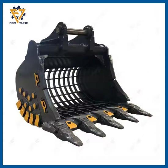 Скальный ковш экскаватора: износостойкий ковш для экскаватора, предназначенный для работы с каменистыми и твёрдыми грунтами. Ковш, изготовленный на основе стандартного ковша, имеет защитный блок в нижней части, что обеспечивает большую прочность корпуса. Использование высокопрочной стали в несколько раз увеличивает срок службы изделия; повышает производительность копания и экономичность. Подходит для выемки твёрдых, слаботвёрдых и выветренных камней, смешанных с грунтом, погрузки твёрдых камней и рудных осколков, а также для других тяжёлых работ.